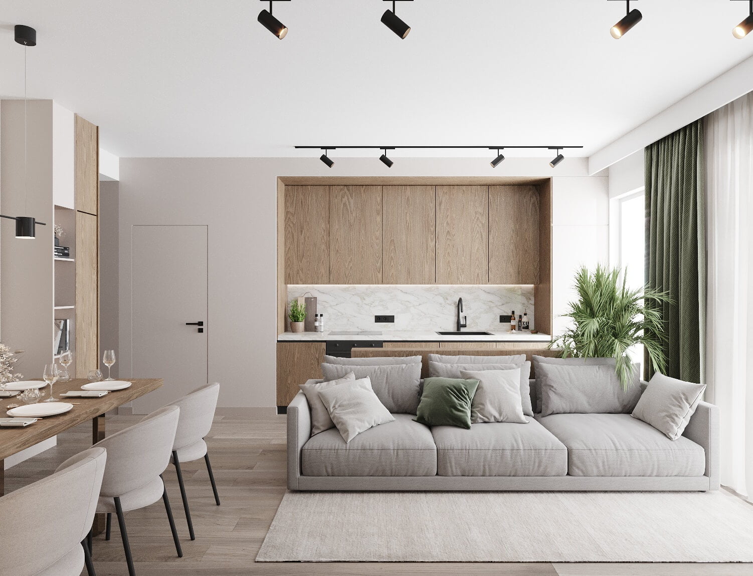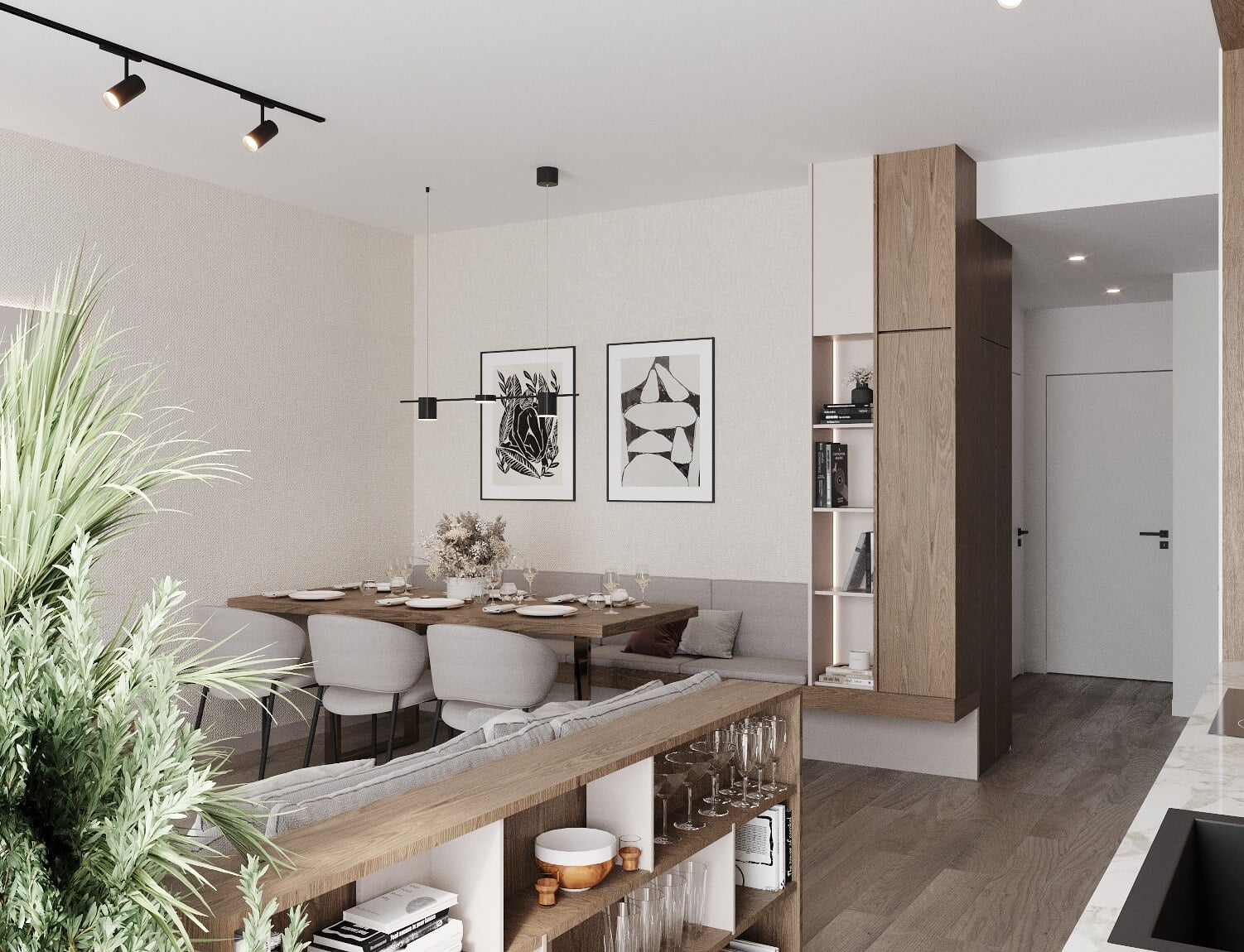 W projektowaniu kładliśmy nacisk na uniwersalność, aby przyciągnąć jak najwięcej potencjalnych najemców. Stąd wybór stonowanej szaro-beżowej kolorystyki, która nadaje wnętrzu elegancji. Ciemne drewno na podłodze i w zabudowach dodaje klasy, a ukryte ciepłe oświetlenie tworzy przytulną atmosferę.